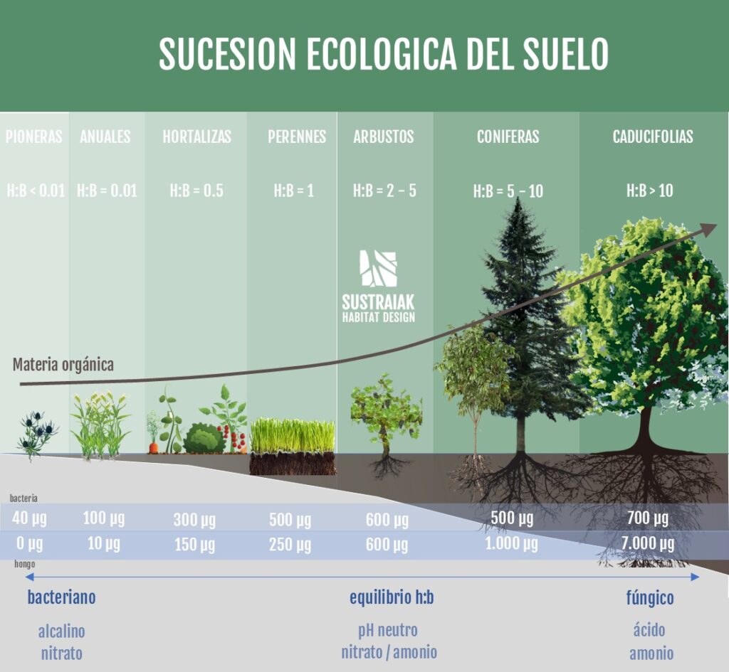 Uno de los conceptos que más nos ayudan en el proceso de regeneración del suelo es el de la sucesión ecológica. Comprenderlo es fundamental si queremos pasar de una agricultura que se limita a medir el pH o los niveles de nitrógeno, fósforo y potasio (NPK) a otra que entiende que existe una dimensión invisible que determina si tus plantas prosperan o te quedas luchando constantemente contra las “malas hierbas”, las plagas y la falta de vigor.